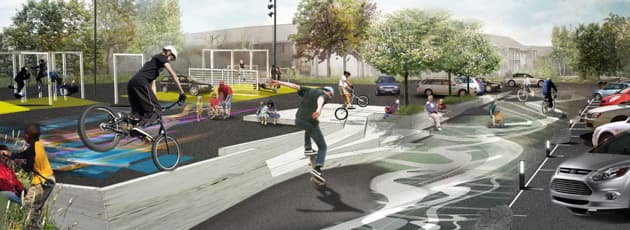 Pladsen bliver delt ind i zoner, så man kan parkere uden at få buler i bilen. F.eks. bliver parkeringsbåsene udformet, så de kan bruges til streetbasket, når bilerne ikke holder der.
