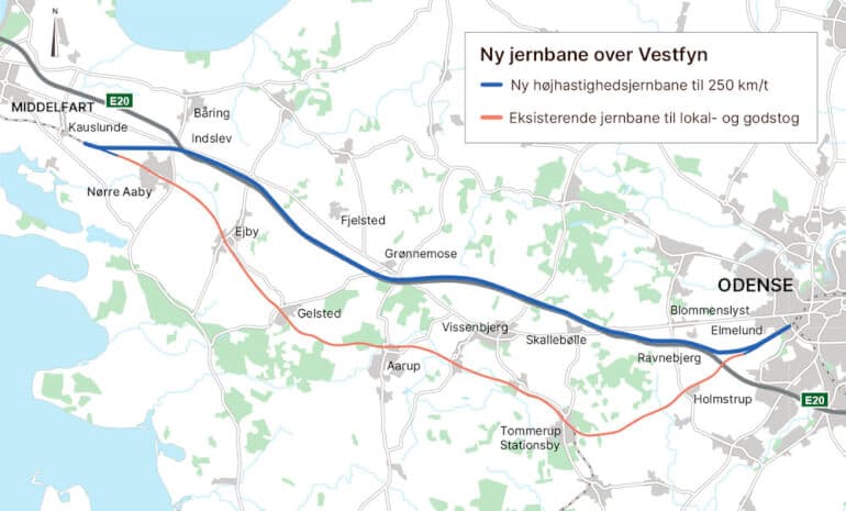 Fra ultimo 2028 skal der kunne køre højhastighedstog over Vestfyn, og derfor starter arbejdet nu med at anlægge en ny elektrificeret jernbane mellem Odense Vest og Kauslunde. Det oplyser Vejdirektoratet.