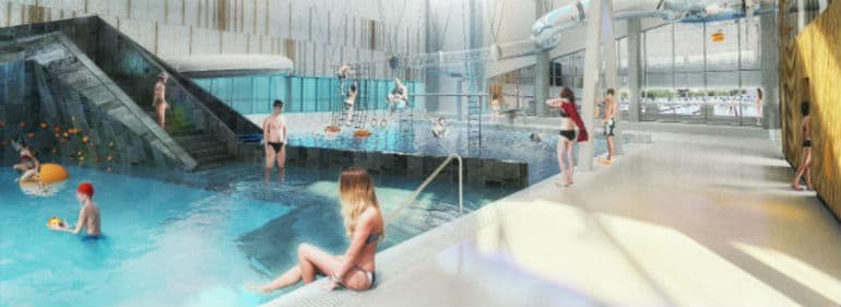 Den eksisterende svømmehal bliver omdannet til to bassiner målrettet vandleg og forskellige bevægelsesaktiviteter som udspring, klatring, Tarzanbane, dykning, trampolin og genoptræning – og rutsjebanen bliver forlænget fra 30 til 50 meter.